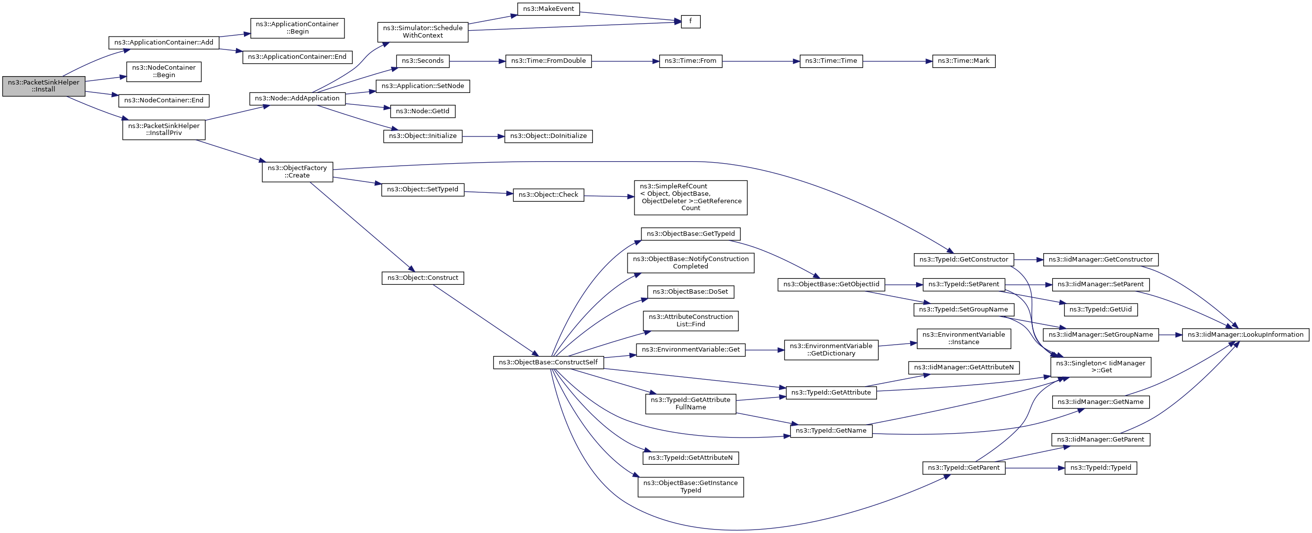 Here is the call graph for this function:| ApplicationContainer ns3::PacketSinkHelper::Install | ( | NodeContainer | c | ) | const |