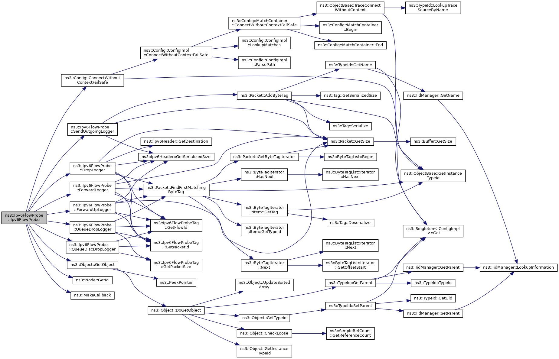 For each node in the simulation, one instance of the class Ipv4FlowProbe is created to monitor that node. Ipv4FlowProbe accomplishes this by connecting callbacks to trace sources in the Ipv6L3Protocol interface of the node.