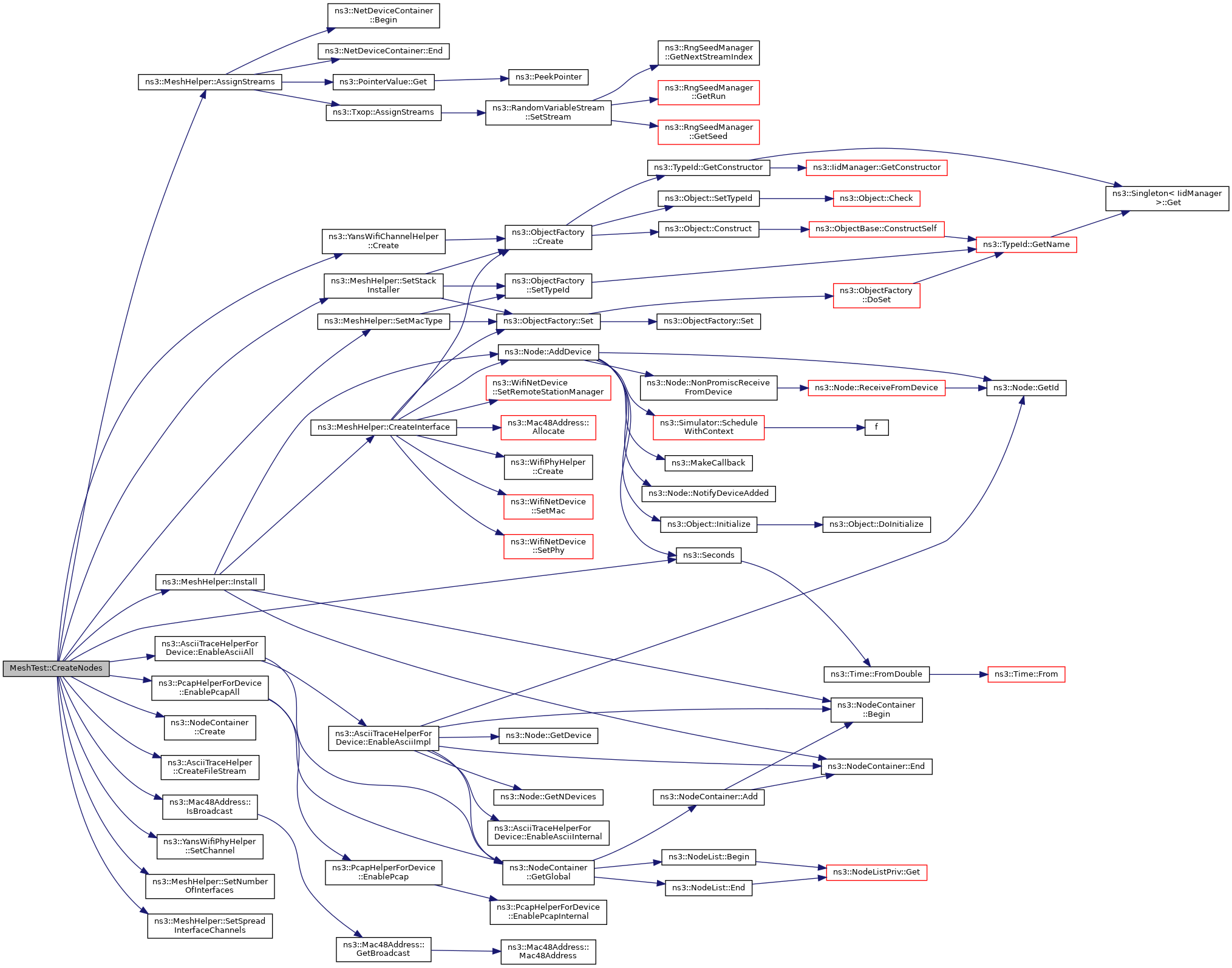 References ns3::MeshHelper::AssignStreams(), ns3::YansWifiChannelHelper::Create(), ns3::NodeContainer::Create(), ns3::AsciiTraceHelper::CreateFileStream(), ns3::AsciiTraceHelperForDevice::EnableAsciiAll(), ns3::PcapHelperForDevice::EnablePcapAll(), ns3::MeshHelper::Install(), ns3::Mac48Address::IsBroadcast(), m_ascii, m_chan, m_nIfaces, m_pcap, m_randomStart, m_root, m_stack, m_step, m_xSize, m_ySize, mesh, meshDevices, third::mobility, nodes, ns3::Seconds(), ns3::YansWifiPhyHelper::SetChannel(), ns3::MeshHelper::SetMacType(), ns3::MeshHelper::SetNumberOfInterfaces(), ns3::MeshHelper::SetSpreadInterfaceChannels(), and ns3::MeshHelper::SetStackInstaller().