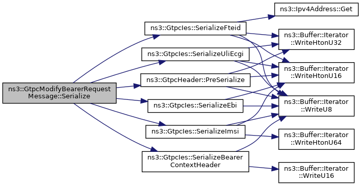 References m_bearerContextsToBeModified, m_imsi, m_uliEcgi, ns3::GtpcHeader::PreSerialize(), ns3::GtpcIes::SerializeBearerContextHeader(), ns3::GtpcIes::serializedSizeEbi, ns3::GtpcIes::serializedSizeFteid, ns3::GtpcIes::SerializeEbi(), ns3::GtpcIes::SerializeFteid(), ns3::GtpcIes::SerializeImsi(), ns3::GtpcIes::SerializeUliEcgi(), and two-ray-to-three-gpp-ch-calibration::start.