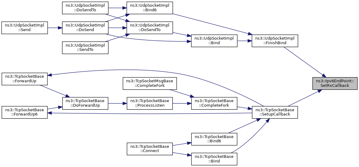 Here is the caller graph for this function:| void ns3::Ipv6EndPoint::SetRxCallback | ( | Callback< void, Ptr< Packet >, Ipv6Header, uint16_t, Ptr< Ipv6Interface >> | callback | ) |