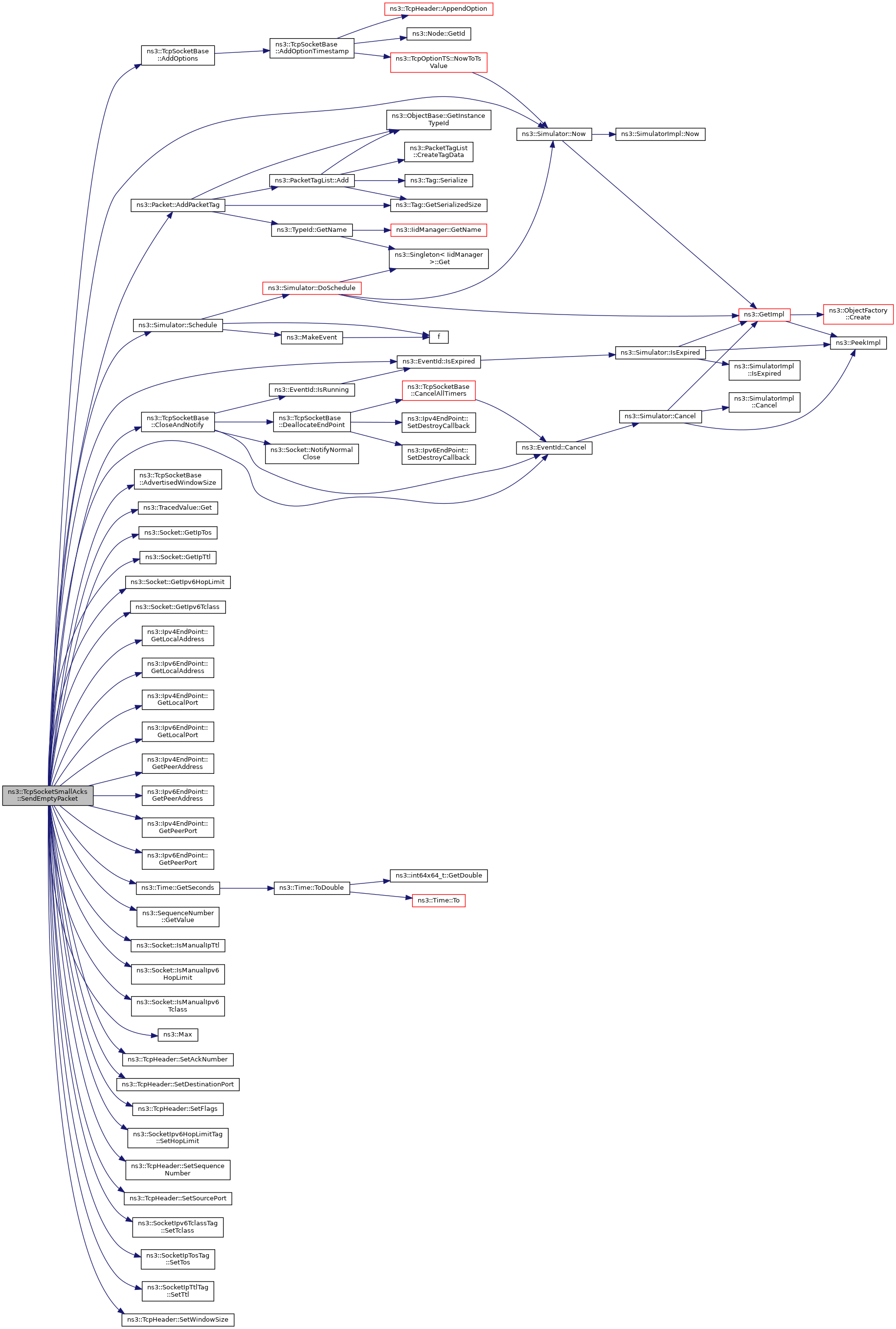 References ns3::TcpHeader::ACK, ns3::TcpSocketBase::AddOptions(), ns3::Packet::AddPacketTag(), ns3::TcpSocketBase::AdvertisedWindowSize(), ns3::EventId::Cancel(), ns3::TcpSocketBase::CloseAndNotify(), ns3::TcpSocket::CLOSING, ns3::TcpHeader::FIN, ns3::TcpSocket::FIN_WAIT_1, ns3::TracedValue< T >::Get(), ns3::Socket::GetIpTos(), ns3::Socket::GetIpTtl(), ns3::Socket::GetIpv6HopLimit(), ns3::Socket::GetIpv6Tclass(), ns3::Ipv4EndPoint::GetLocalAddress(), ns3::Ipv6EndPoint::GetLocalAddress(), ns3::Ipv4EndPoint::GetLocalPort(), ns3::Ipv6EndPoint::GetLocalPort(), ns3::Ipv4EndPoint::GetPeerAddress(), ns3::Ipv6EndPoint::GetPeerAddress(), ns3::Ipv4EndPoint::GetPeerPort(), ns3::Ipv6EndPoint::GetPeerPort(), ns3::Time::GetSeconds(), ns3::SequenceNumber< NUMERIC_TYPE, SIGNED_TYPE >::GetValue(), ns3::EventId::IsExpired(), ns3::Socket::IsManualIpTtl(), ns3::Socket::IsManualIpv6HopLimit(), ns3::Socket::IsManualIpv6Tclass(), ns3::TcpSocket::LAST_ACK, ns3::Socket::m_boundnetdevice, m_bytesLeftToBeAcked, m_bytesToAck, ns3::TcpSocketBase::m_clockGranularity, ns3::TcpSocketBase::m_cnTimeout, ns3::TcpSocketBase::m_delAckCount, ns3::TcpSocketBase::m_delAckEvent, ns3::TcpSocketBase::m_endPoint, ns3::TcpSocketBase::m_endPoint6, m_lastAckedSeq, ns3::TcpSocketBase::m_minRto, ns3::TcpSocketState::m_nextTxSequence, ns3::TcpSocketBase::m_retxEvent, ns3::TcpSocketBase::m_rto, ns3::TcpSocketBase::m_rtt, ns3::TcpSocketState::m_rxBuffer, ns3::TcpSocketBase::m_state, ns3::TcpSocketBase::m_synCount, ns3::TcpSocketBase::m_synRetries, ns3::TcpSocketBase::m_tcb, ns3::TcpSocketBase::m_tcp, ns3::TcpSocketBase::m_txTrace, ns3::Max(), ns3::Simulator::Now(), NS_LOG_DEBUG, NS_LOG_LOGIC, NS_LOG_WARN, ns3::Simulator::Schedule(), ns3::TcpHeader::SetAckNumber(), ns3::TcpHeader::SetDestinationPort(), ns3::TcpHeader::SetFlags(), ns3::SocketIpv6HopLimitTag::SetHopLimit(), ns3::TcpHeader::SetSequenceNumber(), ns3::TcpHeader::SetSourcePort(), ns3::SocketIpv6TclassTag::SetTclass(), ns3::SocketIpTosTag::SetTos(), ns3::SocketIpTtlTag::SetTtl(), ns3::TcpHeader::SetWindowSize(), and ns3::TcpHeader::SYN.