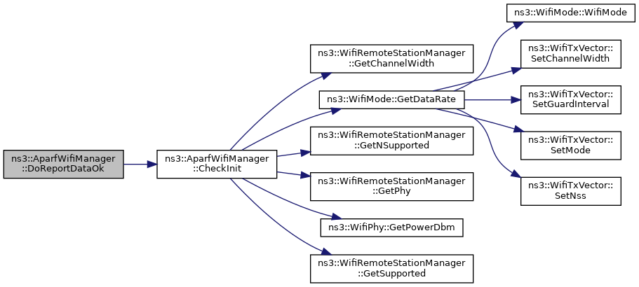 References CheckInit(), ns3::WifiRemoteStationManager::GetAggregation(), ns3::WifiRemoteStationManager::GetChannelWidth(), ns3::WifiMode::GetDataRate(), ns3::WifiMode::GetModulationClass(), ns3::WifiRemoteStationManager::GetPhy(), ns3::WifiPhy::GetPowerDbm(), ns3::GetPreambleForTransmission(), ns3::WifiRemoteStationManager::GetShortPreambleEnabled(), ns3::WifiRemoteStationManager::GetSupported(), ns3::WifiRemoteStationState::m_address, m_powerChange, ns3::AparfWifiRemoteStation::m_powerLevel, ns3::AparfWifiRemoteStation::m_prevPowerLevel, ns3::AparfWifiRemoteStation::m_prevRateIndex, m_rateChange, ns3::AparfWifiRemoteStation::m_rateIndex, ns3::WifiRemoteStation::m_state, and NS_LOG_FUNCTION.