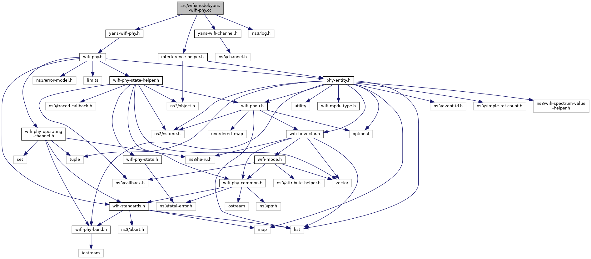 Include dependency graph for yans-wifi-phy.cc:Go to the source code of this file.