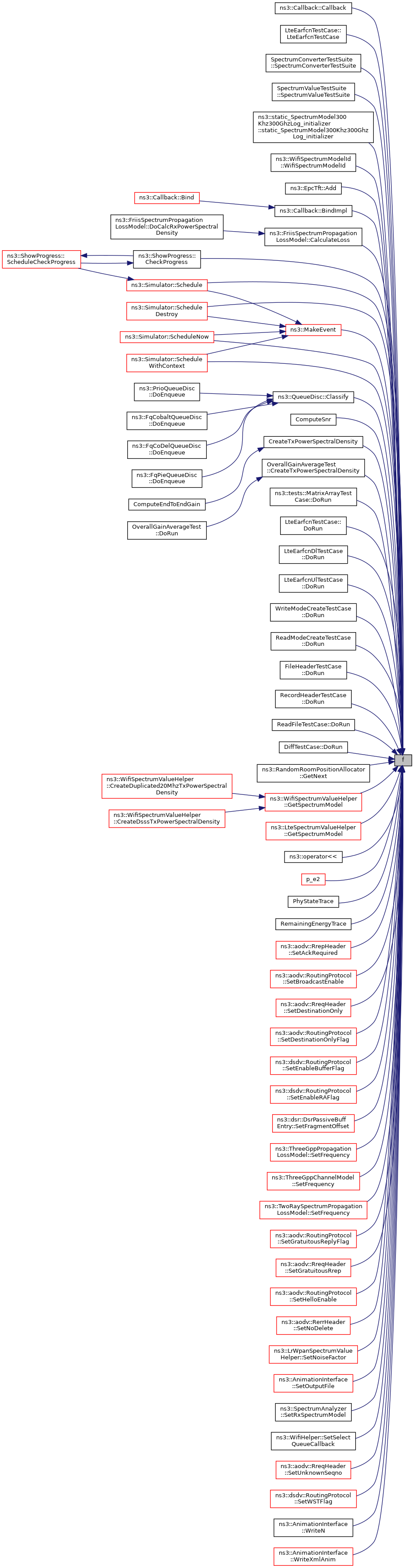 Referenced by ns3::Callback< R, UArgs >::Callback(), LteEarfcnTestCase::LteEarfcnTestCase(), SpectrumConverterTestSuite::SpectrumConverterTestSuite(), SpectrumValueTestSuite::SpectrumValueTestSuite(), ns3::static_SpectrumModel300Khz300GhzLog_initializer::static_SpectrumModel300Khz300GhzLog_initializer(), ns3::WifiSpectrumModelId::WifiSpectrumModelId(), ns3::EpcTft::Add(), ns3::Callback< R, UArgs >::BindImpl(), ns3::FriisSpectrumPropagationLossModel::CalculateLoss(), ns3::ShowProgress::CheckProgress(), ns3::QueueDisc::Classify(), ComputeSnr(), CreateTxPowerSpectralDensity(), OverallGainAverageTest::CreateTxPowerSpectralDensity(), ns3::tests::MatrixArrayTestCase< T >::DoRun(), LteEarfcnTestCase::DoRun(), LteEarfcnDlTestCase::DoRun(), LteEarfcnUlTestCase::DoRun(), WriteModeCreateTestCase::DoRun(), ReadModeCreateTestCase::DoRun(), FileHeaderTestCase::DoRun(), RecordHeaderTestCase::DoRun(), ReadFileTestCase::DoRun(), DiffTestCase::DoRun(), ns3::RandomRoomPositionAllocator::GetNext(), ns3::WifiSpectrumValueHelper::GetSpectrumModel(), ns3::LteSpectrumValueHelper::GetSpectrumModel(), ns3::MakeEvent(), ns3::operator<<(), p_e2(), PhyStateTrace(), RemainingEnergyTrace(), ns3::Simulator::Schedule(), ns3::Simulator::ScheduleDestroy(), ns3::Simulator::ScheduleNow(), ns3::Simulator::ScheduleWithContext(), ns3::aodv::RrepHeader::SetAckRequired(), ns3::aodv::RoutingProtocol::SetBroadcastEnable(), ns3::aodv::RreqHeader::SetDestinationOnly(), ns3::aodv::RoutingProtocol::SetDestinationOnlyFlag(), ns3::dsdv::RoutingProtocol::SetEnableBufferFlag(), ns3::dsdv::RoutingProtocol::SetEnableRAFlag(), ns3::dsr::DsrPassiveBuffEntry::SetFragmentOffset(), ns3::ThreeGppPropagationLossModel::SetFrequency(), ns3::ThreeGppChannelModel::SetFrequency(), ns3::TwoRaySpectrumPropagationLossModel::SetFrequency(), ns3::aodv::RoutingProtocol::SetGratuitousReplyFlag(), ns3::aodv::RreqHeader::SetGratuitousRrep(), ns3::aodv::RoutingProtocol::SetHelloEnable(), ns3::aodv::RerrHeader::SetNoDelete(), ns3::LrWpanSpectrumValueHelper::SetNoiseFactor(), ns3::AnimationInterface::SetOutputFile(), ns3::SpectrumAnalyzer::SetRxSpectrumModel(), ns3::WifiHelper::SetSelectQueueCallback(), ns3::aodv::RreqHeader::SetUnknownSeqno(), ns3::dsdv::RoutingProtocol::SetWSTFlag(), ns3::AnimationInterface::WriteN(), and ns3::AnimationInterface::WriteXmlAnim().