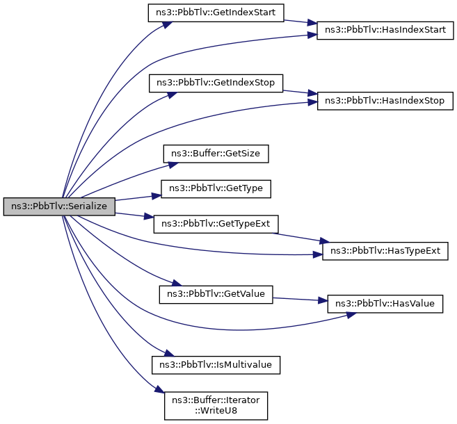 Here is the call graph for this function:| void ns3::PbbTlv::Serialize | ( | Buffer::Iterator & | start | ) | const |