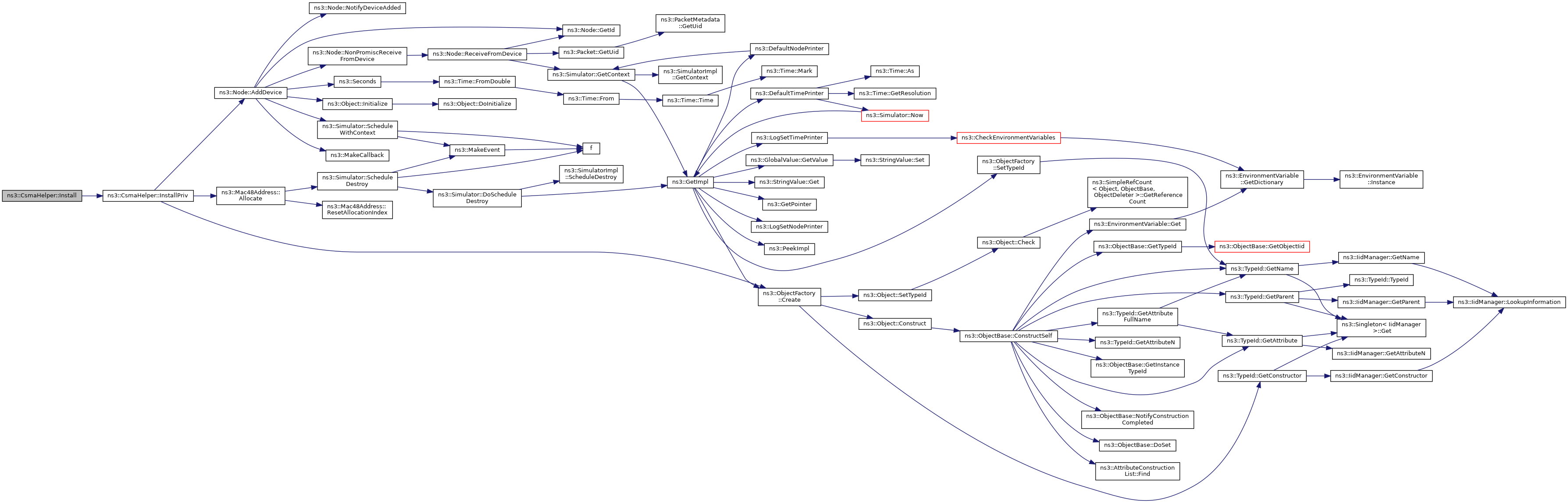 Here is the call graph for this function:| NetDeviceContainer ns3::CsmaHelper::Install | ( | std::string | name | ) | const |