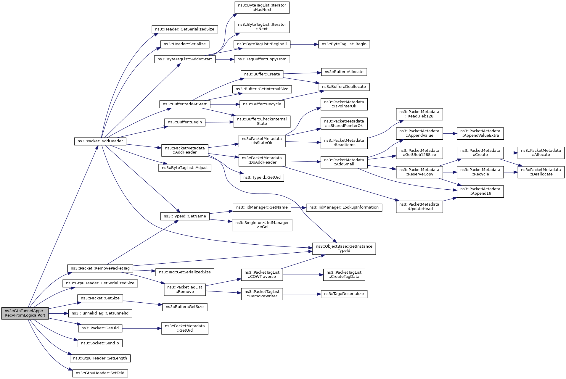 Here is the call graph for this function:| bool ns3::GtpTunnelApp::RecvFromLogicalPort | ( | Ptr< Packet > | packet, |