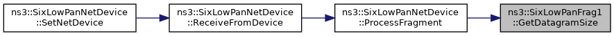 Here is the call graph for this function:| uint16_t ns3::SixLowPanFrag1::GetDatagramSize | ( | ) | const |