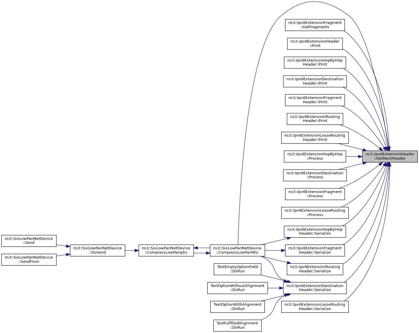 Referenced by ns3::SixLowPanNetDevice::CompressLowPanNhc(), Deserialize(), ns3::Ipv6ExtensionHopByHopHeader::Deserialize(), ns3::Ipv6ExtensionDestinationHeader::Deserialize(), ns3::Ipv6ExtensionFragment::GetFragments(), Print(), ns3::Ipv6ExtensionHopByHopHeader::Print(), ns3::Ipv6ExtensionDestinationHeader::Print(), ns3::Ipv6ExtensionFragmentHeader::Print(), ns3::Ipv6ExtensionRoutingHeader::Print(), ns3::Ipv6ExtensionLooseRoutingHeader::Print(), ns3::Ipv6ExtensionHopByHop::Process(), ns3::Ipv6ExtensionDestination::Process(), and ns3::Ipv6ExtensionLooseRouting::Process().