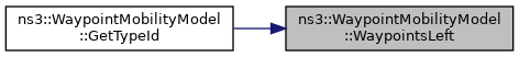 Here is the caller graph for this function:| uint32_t ns3::WaypointMobilityModel::WaypointsLeft | ( | ) | const |